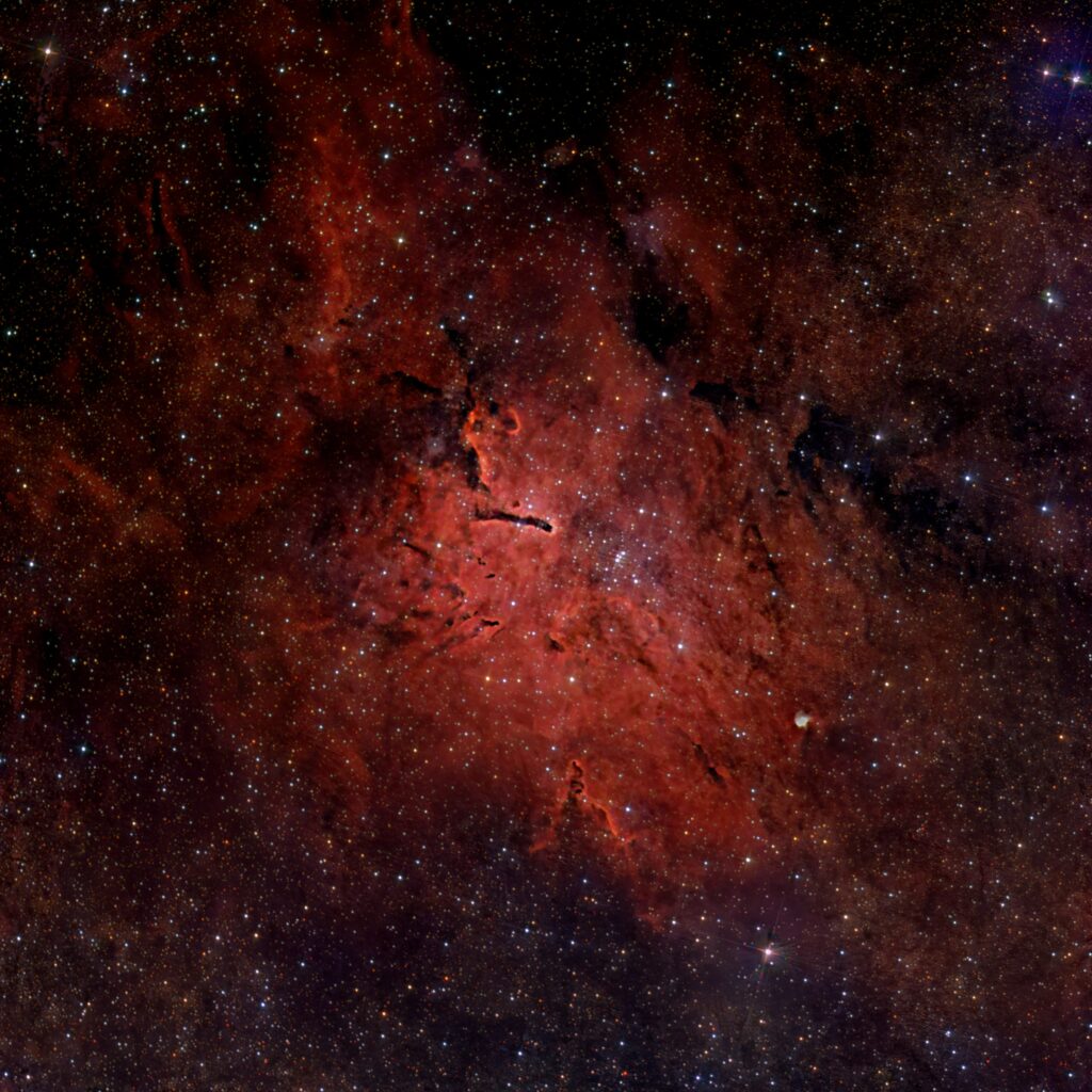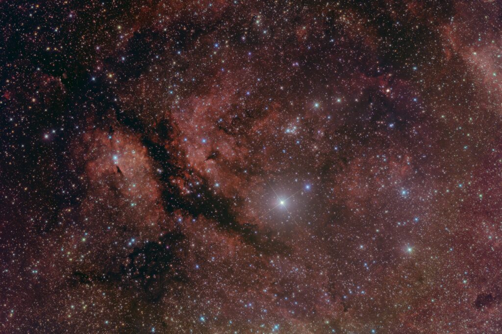Auch der Bereich um den Zentralstern im Schwan zeigt ausgedehnte Bereiche mit angeregtem Wasserstoffgas sowie Dunkelwolken, die die Strahlung der dahinter liegenden Sterne deutlich schwächt.