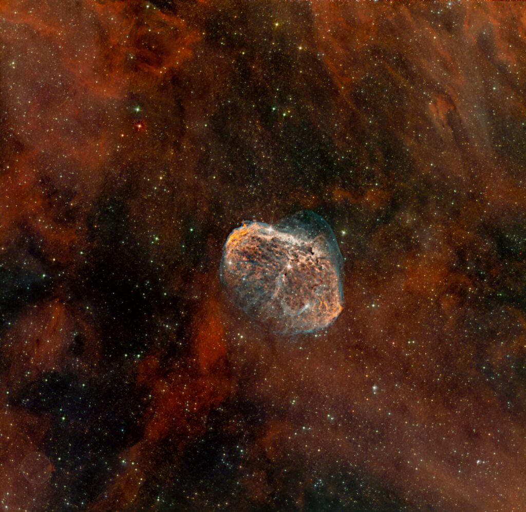 NGC 6888, auch Sichelnebel genannt, recht zentral im Schwan