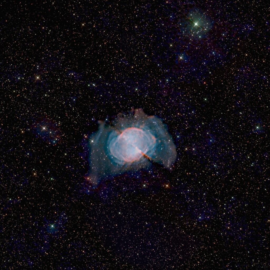 Aufgrund der geringen Größe von 4×6 Bogenminuten wird eigentlich eine große Brennweite zur Abbildung des Nebels benötigt. Hier ist ein Ausschnitt gezeigt einer Aufnahme mit Takahashi Epsilon 160 mit 1,5x Extender und QHY533, 61x2min Belichtung.