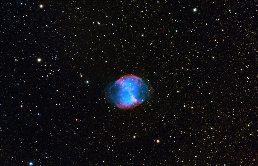Entfernung ca. 1300 LJ. Der Nebel ist vor ca. 10.000Jahren entstanden durch die Explosion eines Riesensternes. Verblieben ist ein heißer weisser Zwerg (ca. 100.000K), den man in der Mitte des Nebels erkennen kann. Die energiereiche UV-Strahlung dieses Zwerges reg die ausgestoßene Gashülle zum Leuchten an, die sich immer weiter ausdehnt.