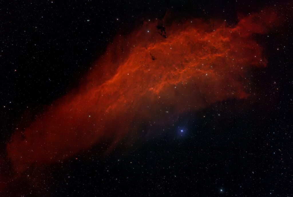 Er ist mit etwa 1200 Lichjahren Entfernung die zu uns nächst gelegene HII-Region. Der helle blaue Stern, Xi-Persei mit Namen Menkib, hat 4. Größenklasse und kann mit bloßem Auge gesehen werden. Er emittiert eine intensive, energiereiche Strahlung, welche die Gaswolken in der Nachbarschaft ionisieren und bei der Rekombination zum Leuchten anregen. Aufgenommen mit der QHY410C am Takahashi Epsilon 160 und mit NBZ-2Linienfilter, Belichtung knapp 4 Stunden bei Halbmond in der Nordheide.